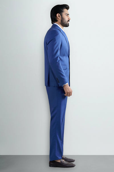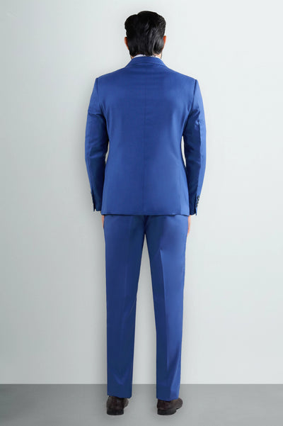 Designed with two flap pockets and a separate pocket for your pocket square, it provides both functionality and style. The fine hand-stitched detailing—a line running elegantly along the collar—adds a mark of craftsmanship that enhances its premium appeal. Whether paired with a crisp white shirt for a business meeting or a patterned tie for a wedding, this blue suit ensures you always look polished and sophisticated.