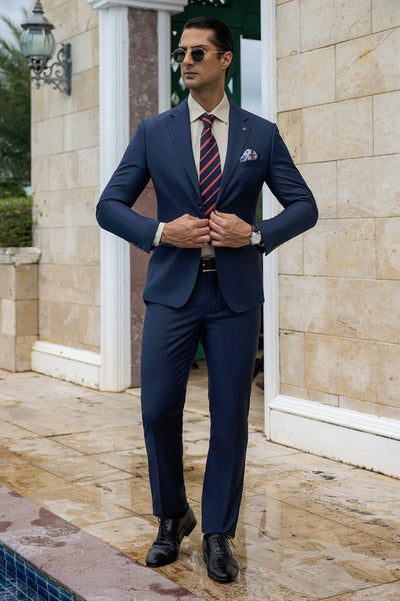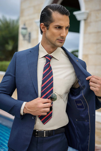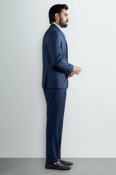 This suit is expertly tailored with a classic two-button closure, two flap pockets, and a dedicated pocket for your pocket square, adding both practicality and elegance. The self-textured fabric gives it a subtle yet distinctive finish, setting it apart from ordinary suiting. A hand-stitched line runs gracefully from the collar, showcasing craftsmanship and attention to detail. Comfortable to wear yet striking in appearance, this suit is designed for the modern gentleman who values sophistication in every detail.