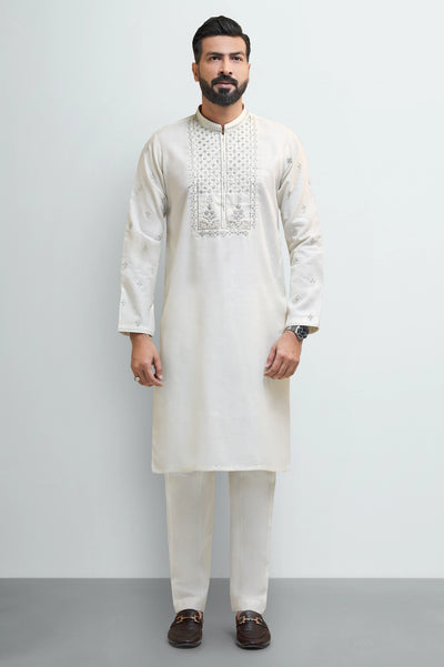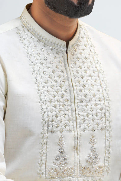 Embrace timeless elegance with the Cream Embroidered Kurta Pajama from the exclusive Tasavvur Collection. This handcrafted set, featuring intricate embroidery and a classic mandarin collar, is perfect for weddings, Eid, and grand celebrations. Crafted from luxurious fabric, it ensures both comfort and a regal look, making it a statement of grace and sophistication. Shop this exquisite festive wear online now.
