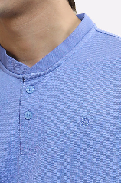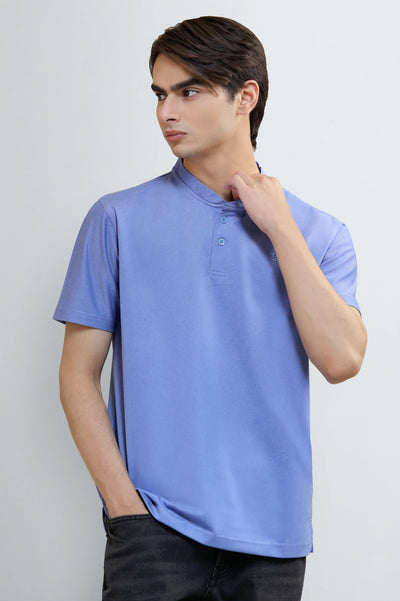 Shop the men's light blue solid stand-up (mandarin) collar polo t-shirt. This regular-fit, short-sleeve top is made from a comfortable cotton-lycra blend fabric, perfect for smart-casual style.