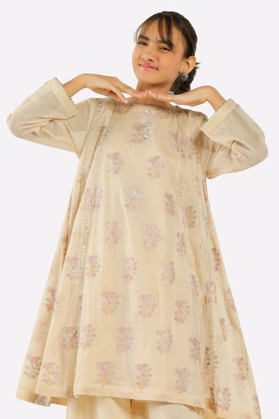 Beige Block Printed Girls 2PC