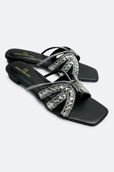 Sparkle & Step Out in Style: Discover the epitome of casual glamour with our French Emporio Black Crystal Bow Slides. These eye-catching sandals are designed for those who love a touch of bling in their everyday wear.