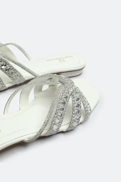 Sparkle & Step Out in Style: Discover the epitome of casual glamour with our French Emporio White Crystal Bow Slides. These eye-catching sandals are designed for those who love a touch of bling in their everyday wear.