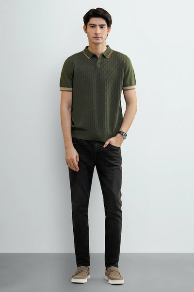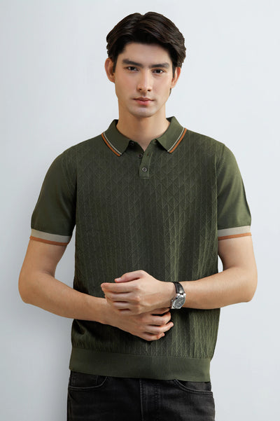 Elevate your smart-casual wardrobe with this sophisticated men's dark green polo shirt. Crafted with a subtle, vertically textured knit fabric, this shirt offers a unique blend of comfort and style.