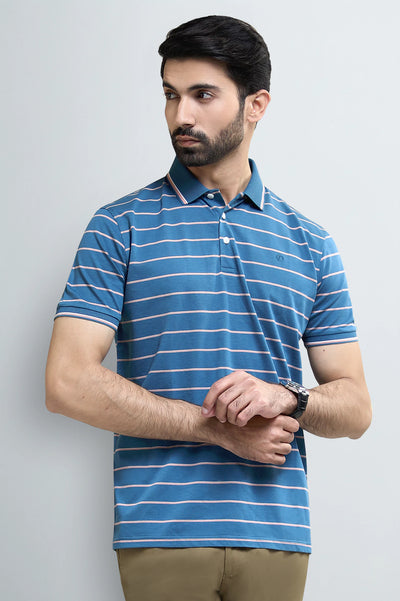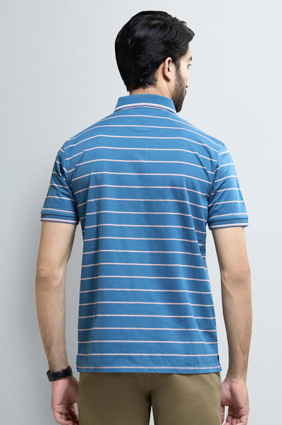 Elevate your casual wardrobe with this stylish men's blue striped polo t-shirt. Crafted from a soft cotton blend fabric, this regular-fit polo offers both comfort and a refined, sporty appeal. Featuring a classic polo collar, half sleeves, and a vibrant blue color with contrasting white and pink stripes, it's perfect for weekend wear or smart-casual occasions. Shop this versatile and fashionable polo shirt today for a timeless addition to your collection.