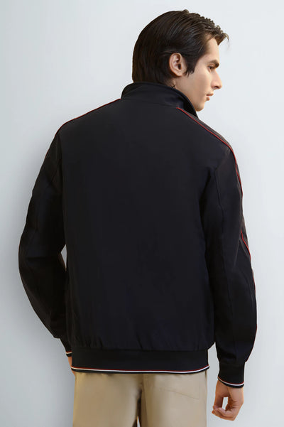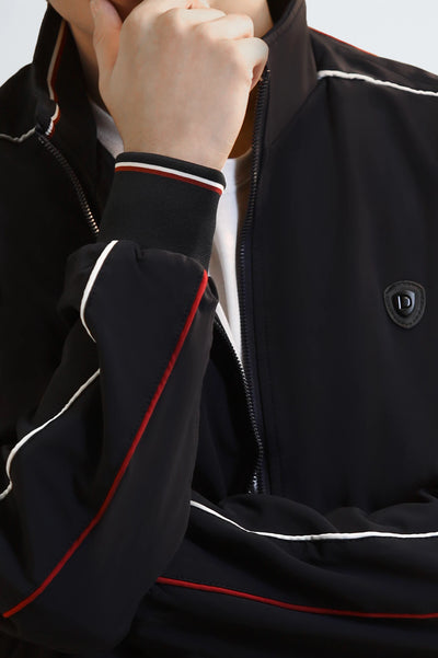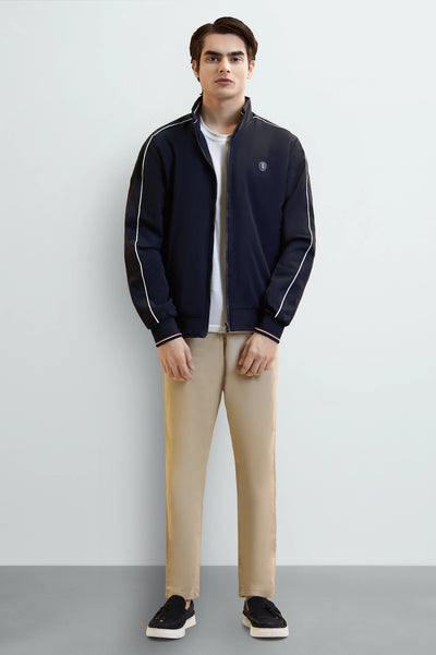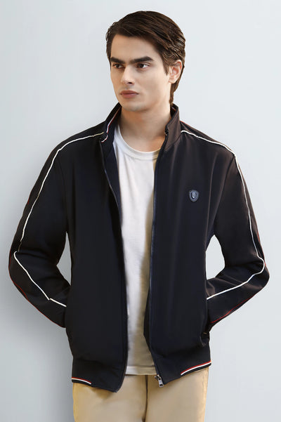Elevate your casual style with this sharp navy blue striped sporty jacket from Diners. Tailored to sartorial perfection from a premium fabric polyester , this regular-fit jacket assures a soft and soothing touch against the skin. It features a stylish mock collar, a full zip closure, long sleeves with white and red piping details, and a straight hemline. The design exudes a modern, athletic look suitable for various casual occasions.