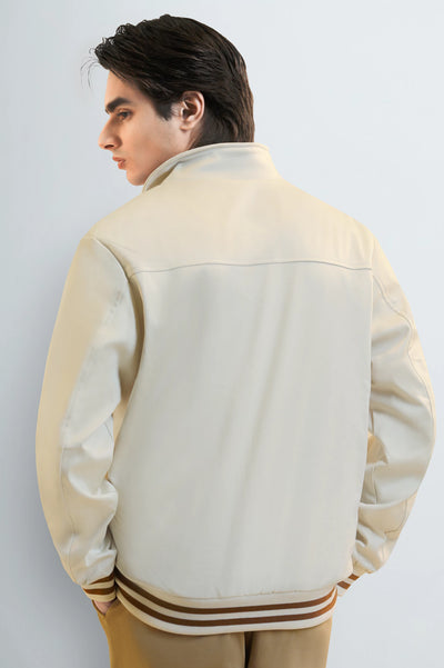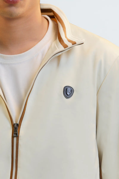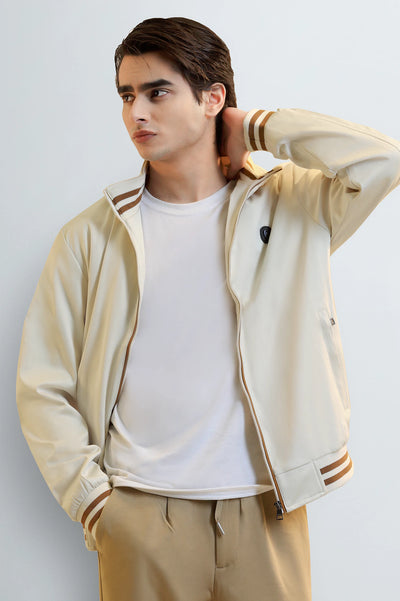 Elevate your casual style with this sleek cream bomber jacket for men, featuring sharp brown and white striped details on the collar, cuffs, and hem. Perfect for layering over a simple white tee and khaki pants for a smart, modern look. Shop this essential piece of men's outerwear today.