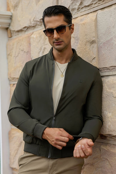 Elevate a casual style with this versatile olive green bomber jacket for men. Tailored to a regular fit from high-quality fabric, it offers comfort and a sleek look. Featuring a full zip closure, mock collar, and long sleeves, this jacket is perfect for laid-back outings or as a stylish, light layer for spring and autumn.