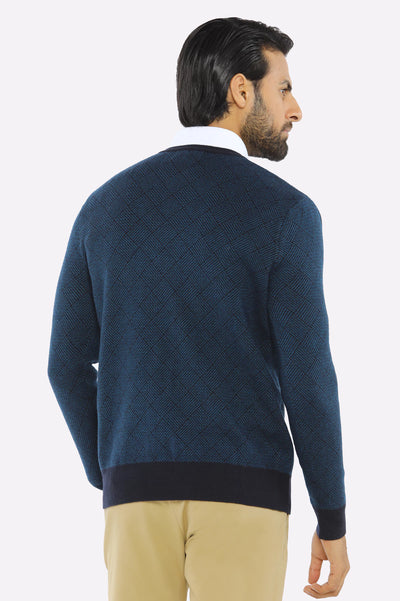 Product Description: This classic V-neck full-sleeve sweater combines sophistication with simplicity, making it a staple piece for any wardrobe. The subtle checkered pattern adds a modern touch to the timeless V-neck design, perfect for those who appreciate understated elegance.
