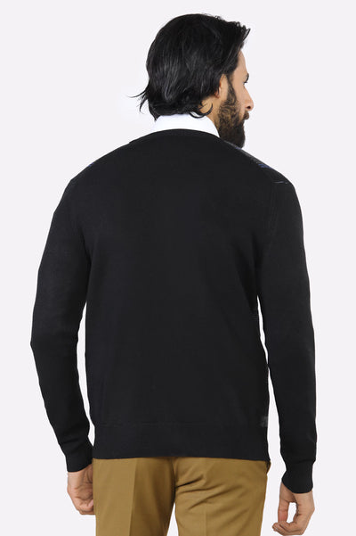 Color and Style: Featuring a black with subtle herringbone detailing on the front panel, this cardigan adds texture and depth to any outfit. The solid blue sleeves and trim provide a polished, cohesive look that pairs effortlessly with tailored trousers or casual jeans.