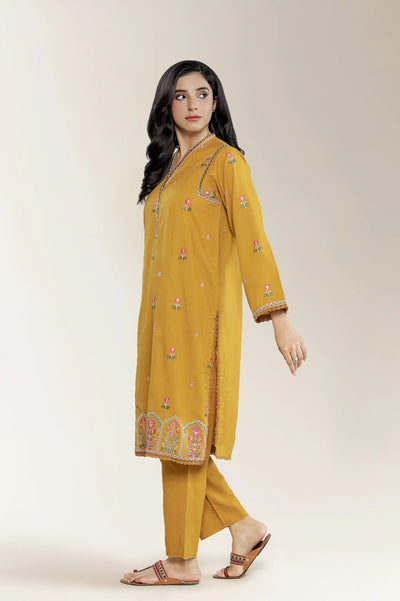 Bring a fresh and vibrant look to your wardrobe with this 2-piece embroidered set. The mustard shirt is adorned with beautiful pink floral embroidery that beautifully enhances the base color, adding a cheerful and elegant touch. Paired with straight pants, this outfit offers a comfortable and polished fit, perfect for casual outings, small gatherings, or daytime events.